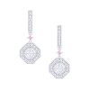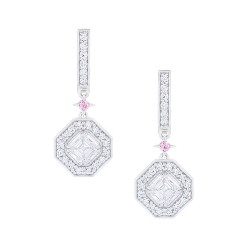 Beautifully articulated in 18ct white gold, these drop earrings feature two exquisite Asscher cut diamonds equaling 2.07ct E/VVS in a pave' set halo to accentuate their mirror facets. Although modest in concept, add the 6PP pink Argyle diamonds and they become truly sublime.